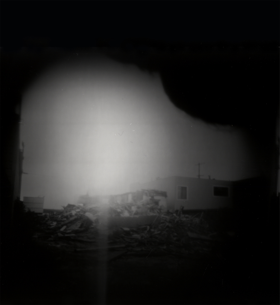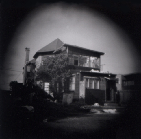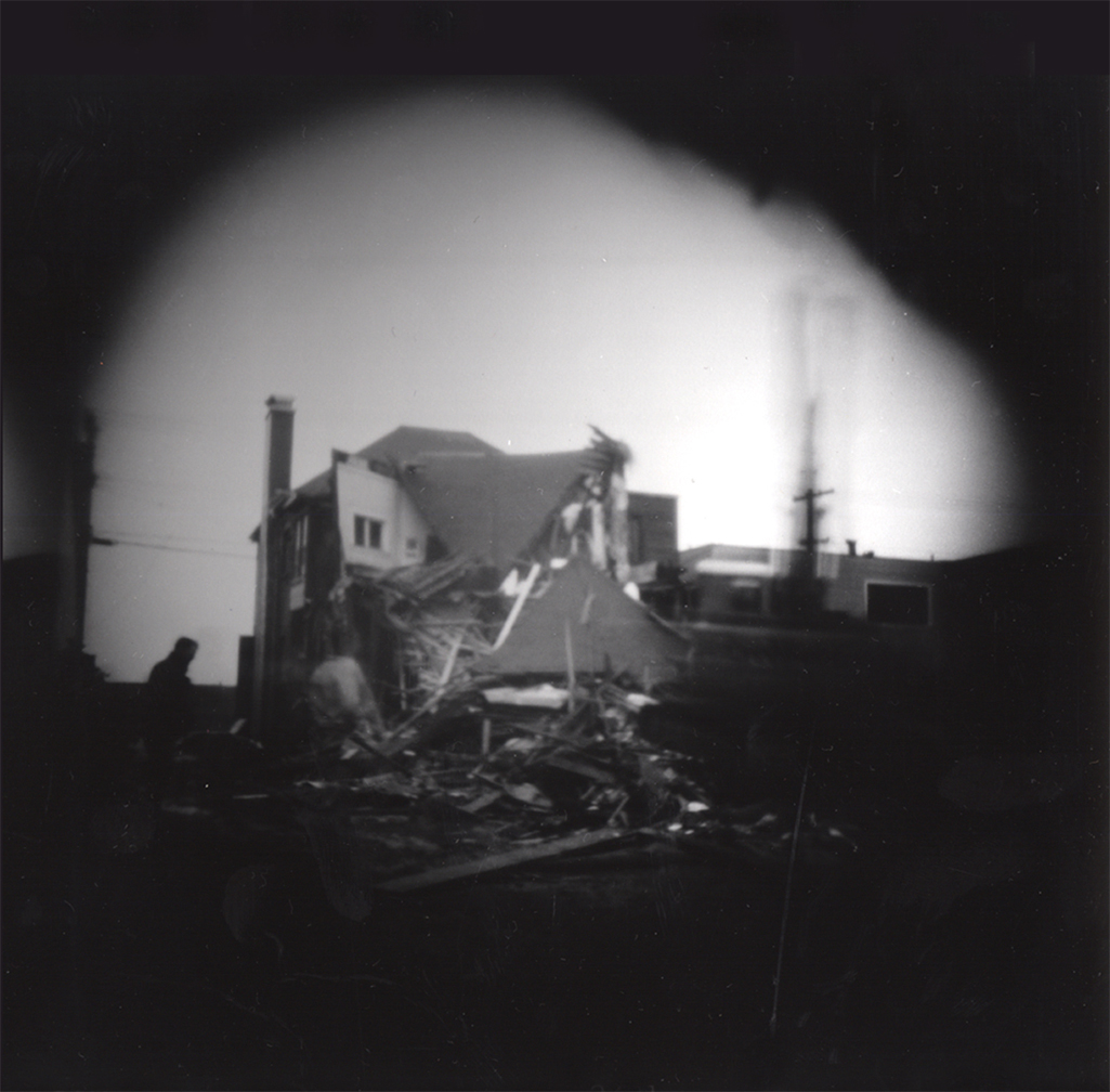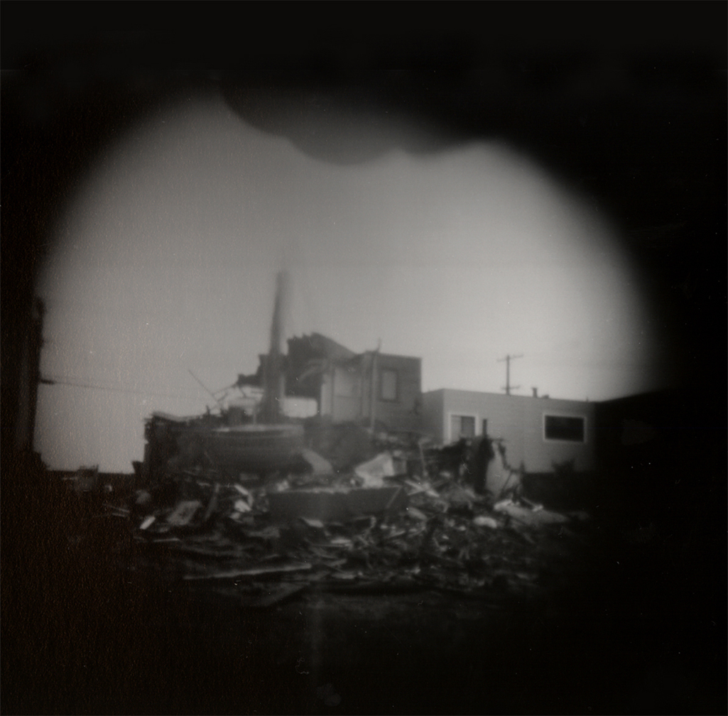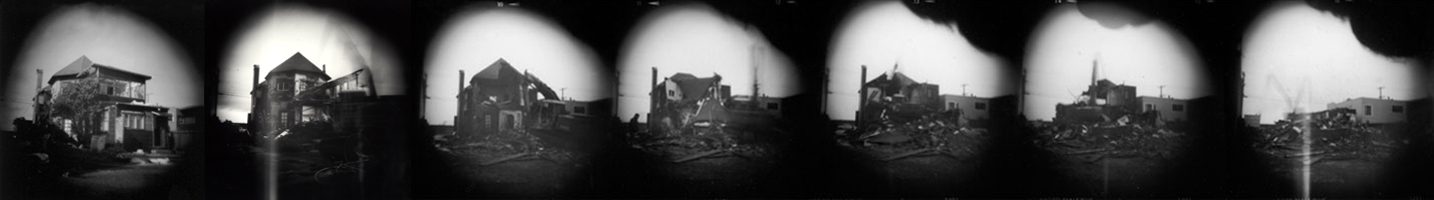 After researching various demolition sites within San Francisco, I chose a house on the Great Highway that had various histories; it’s use as a brothel, a family dwelling, and an apartment complex. I built a pinhole camera to document the entire demolition onto a roll of 120 mm film.