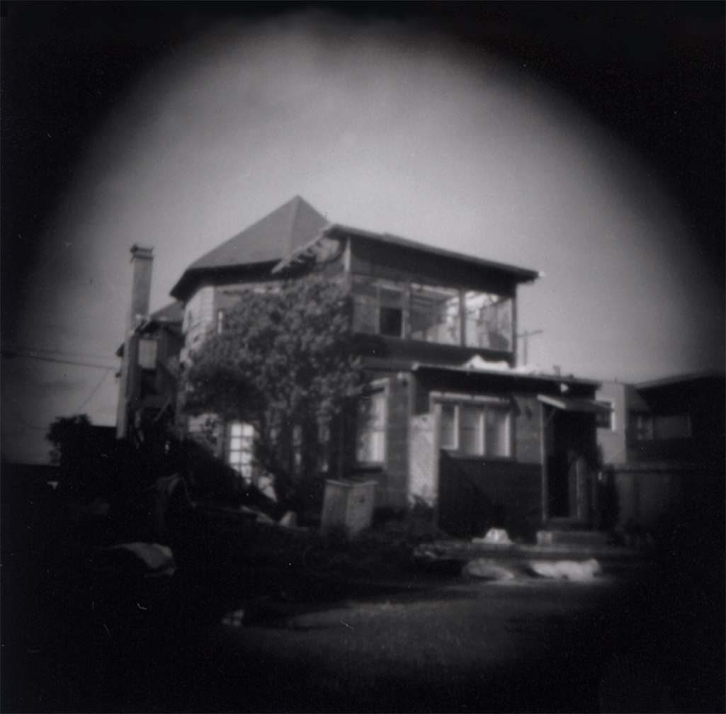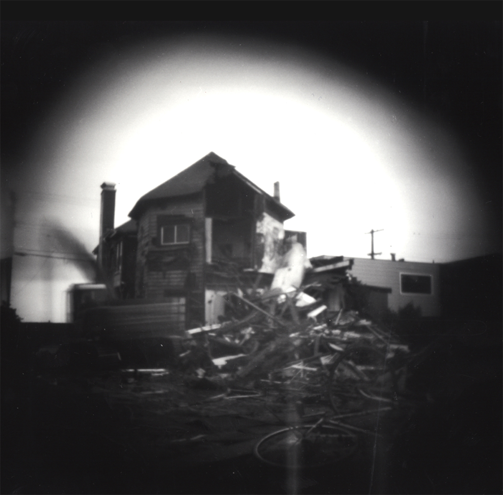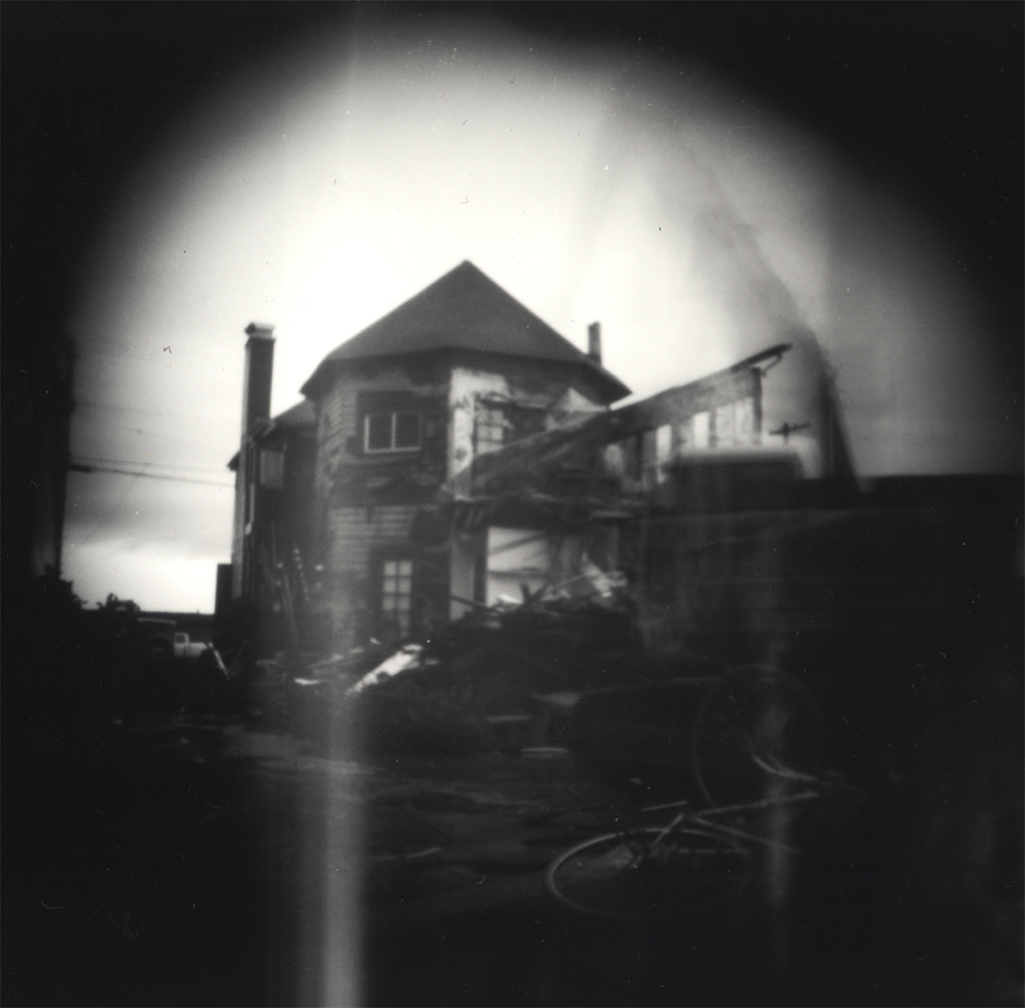After researching various demolition sites within San Francisco, I chose a house on the Great Highway that had various histories; it’s use as a brothel, a family dwelling, and an apartment complex. I built a pinhole camera to document the entire demolition onto a roll of 120 mm film.