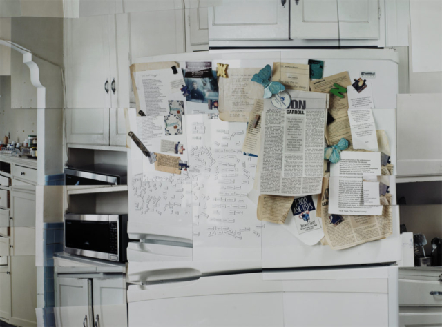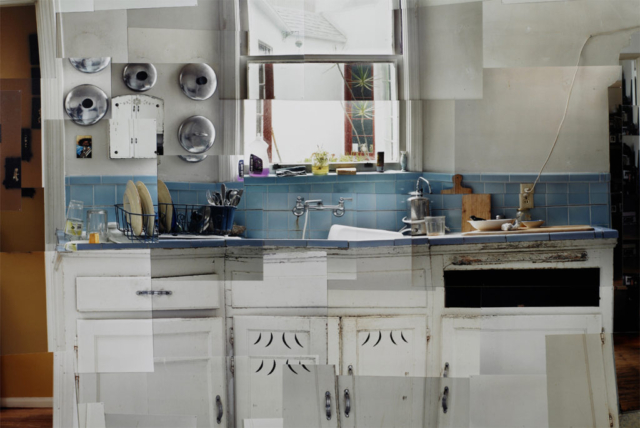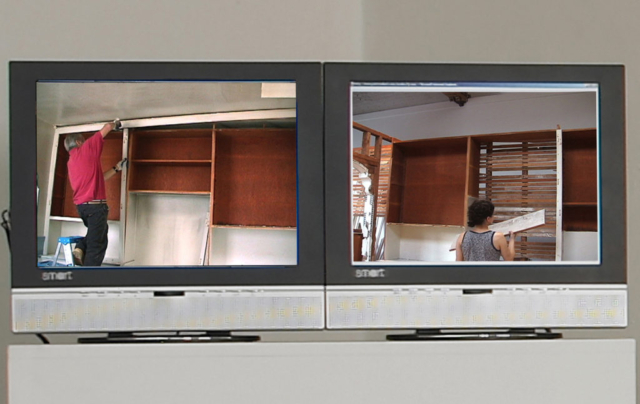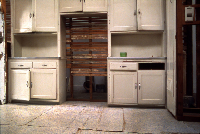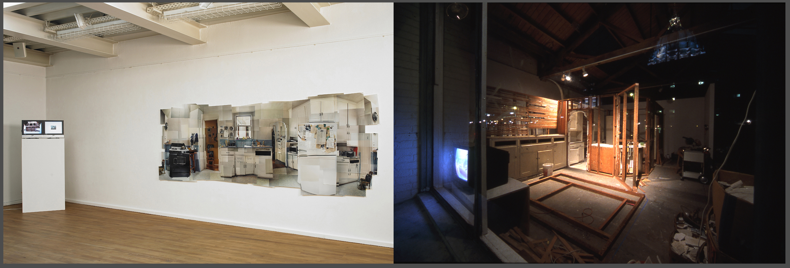 At the Künstlerhause, Saarbrücken, a photomontage of the kitchen (prior to demolition) along with two monitors was installed. The left monitor played a video loop of the destruction, the right monitor revealed live-feed images of my reconstruction from California. The dual sited sculpture reveals a laborious and futile journey of trial and error.