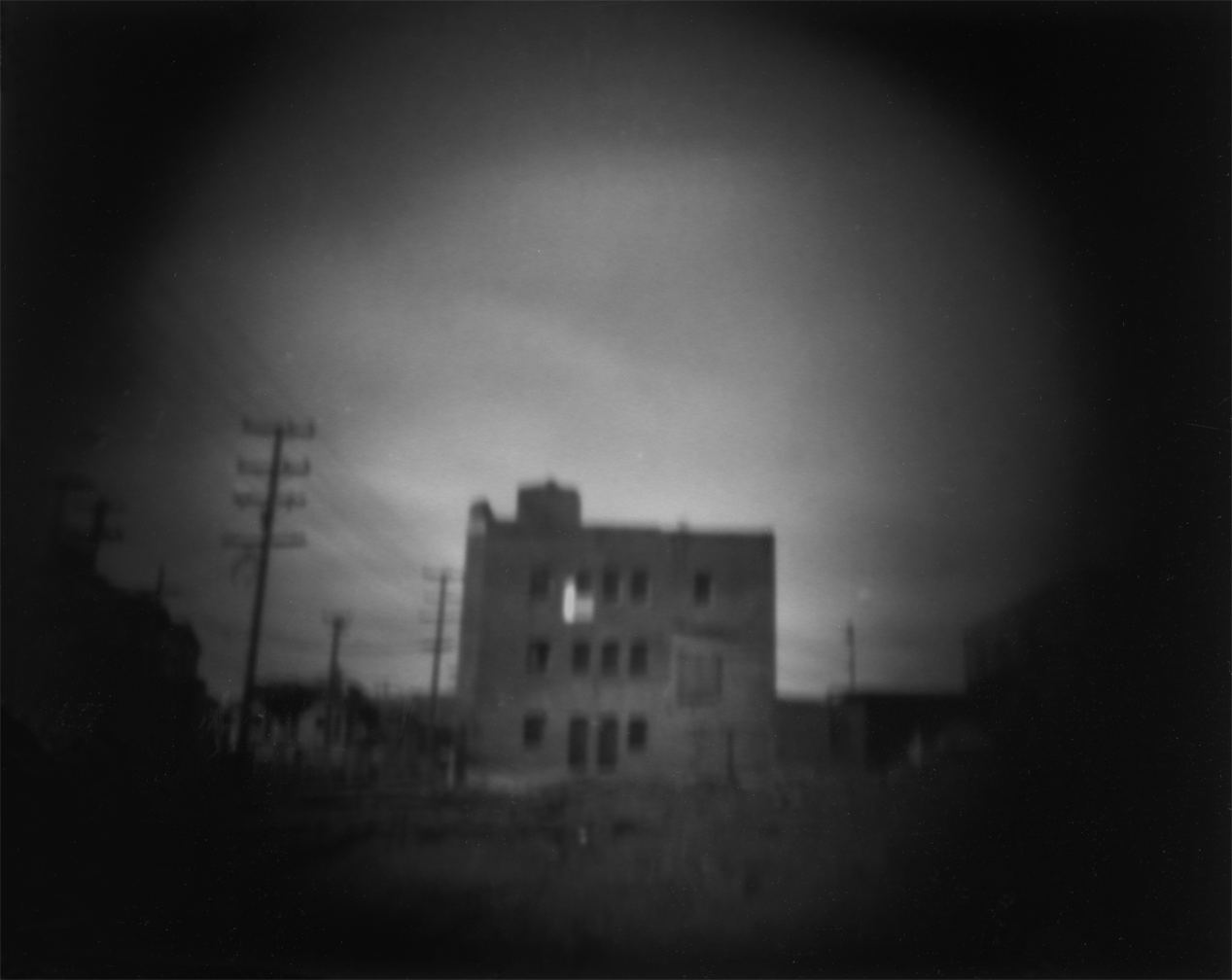 I first began to chase demolitions in 1999 when the dot-com boom was at it’s height. Not an inquiry into nostalgia, the pinhole was used because it had no lens and made a direct contact with the shape of place through light. It also formed a natural peephole. I found places deemed for demolition through City Permits.